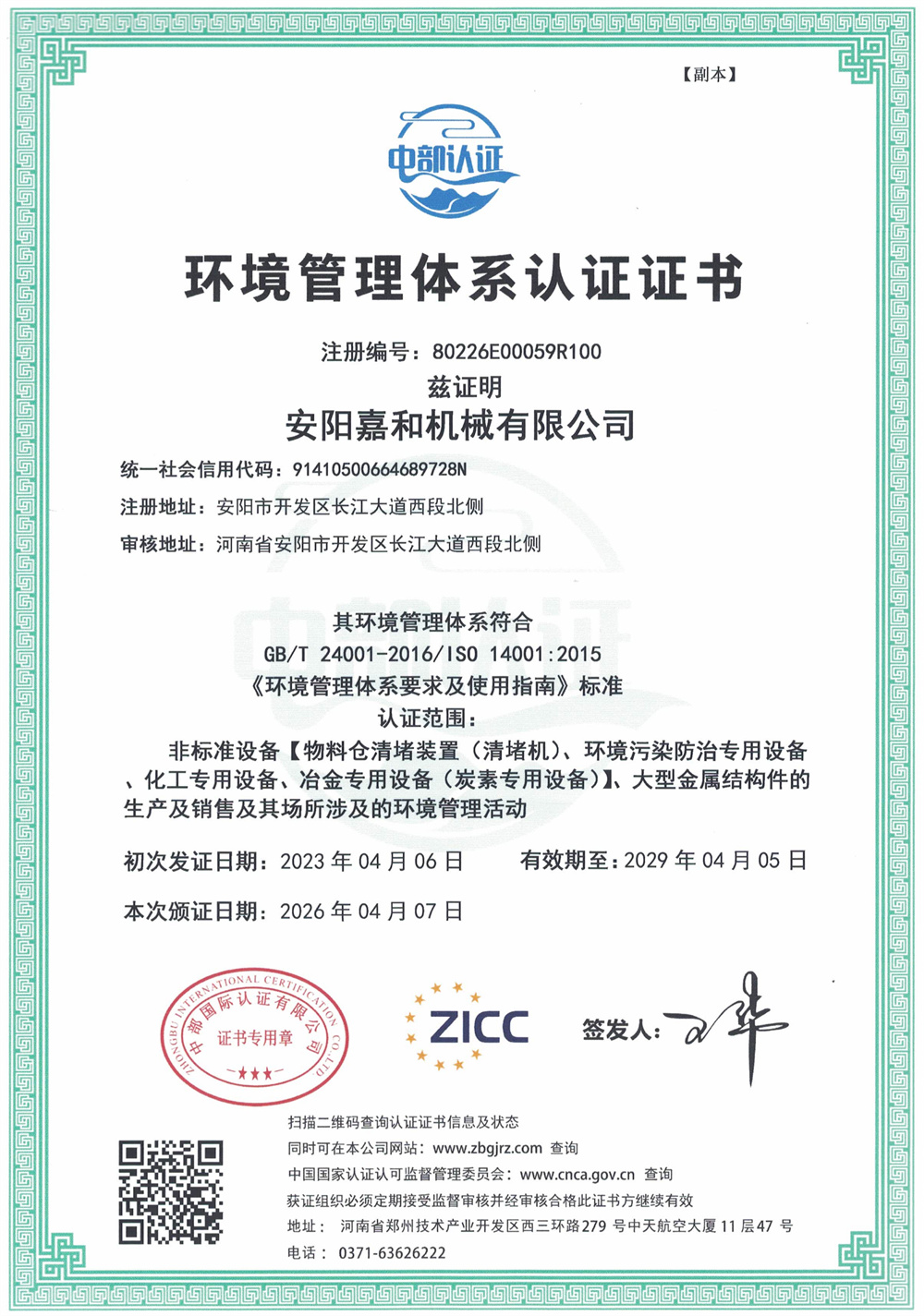 環(huán)境管理體系認(rèn)證證書(shū)